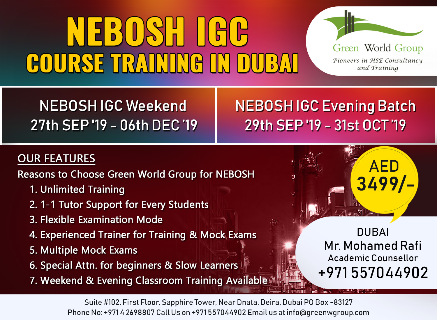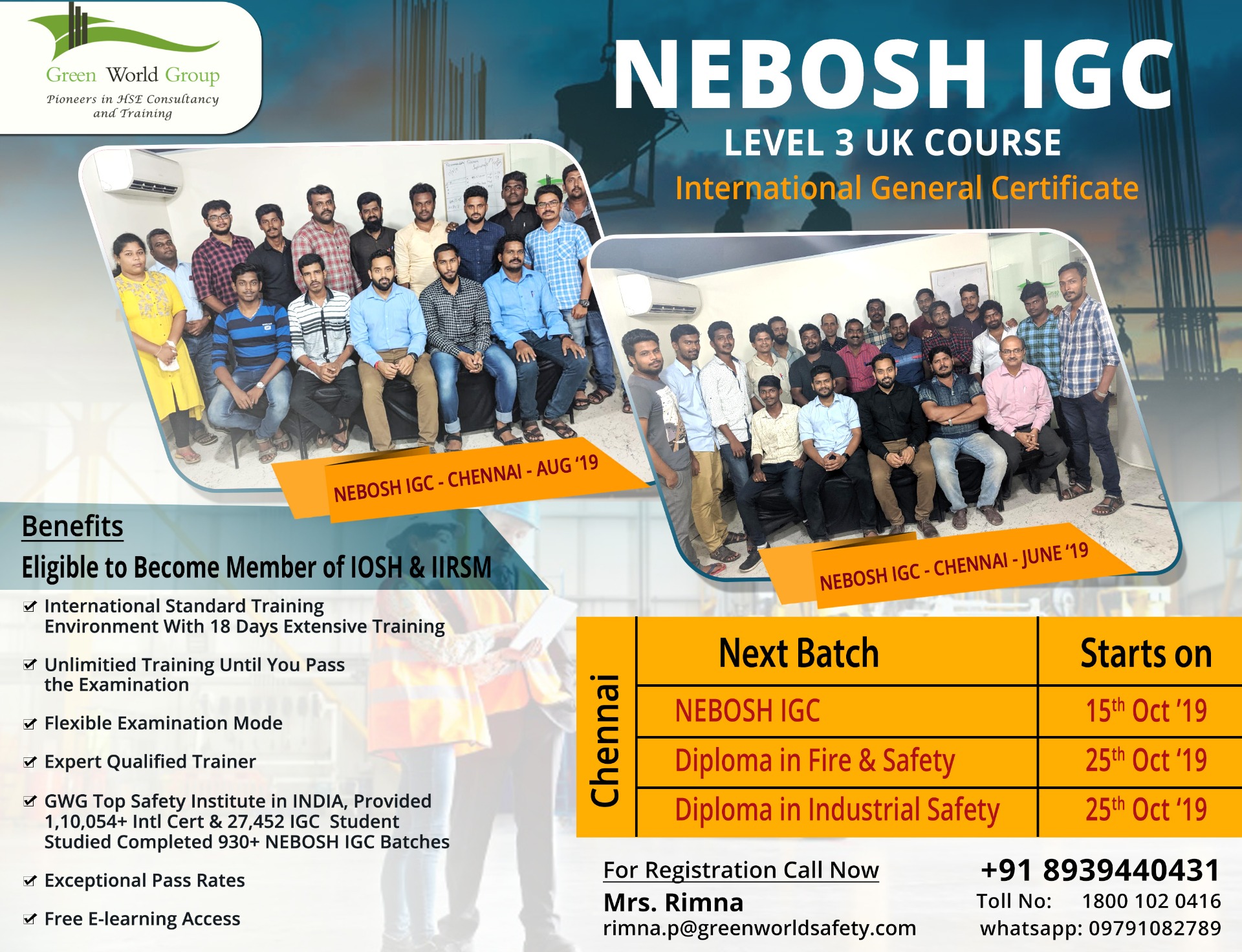 Green World Group is a Safety Training the organization, which provides world-class safety training and consulting services in Nebosh IGC, Diploma in Industrial Safety, Diploma in Fire and medium and large enterprises, etc.;
