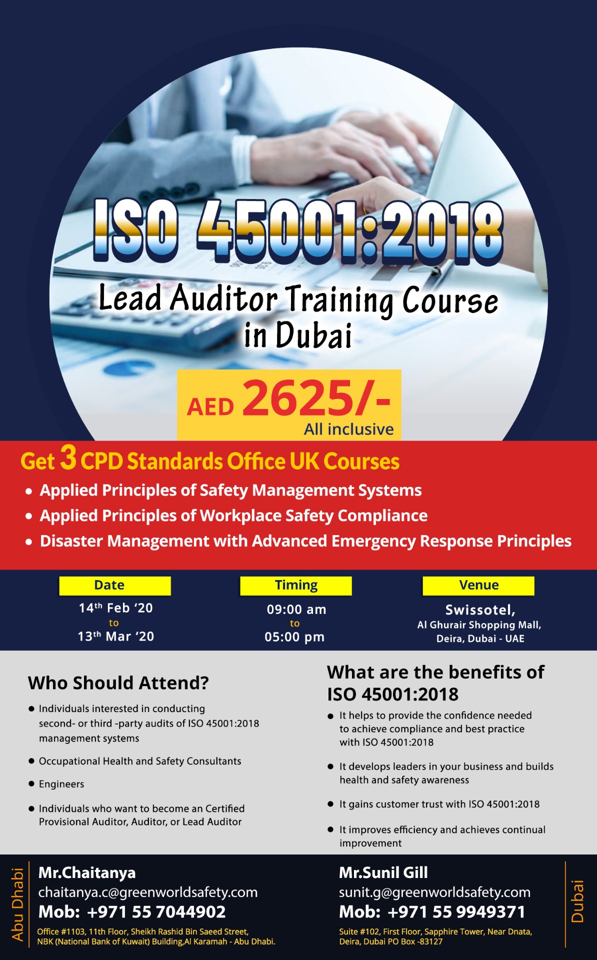 ISO 45001: 2018 Lead Auditor Training in Dubai helps the learners to identify the necessities of establishes and maintain the Occupational Health and Safety Management system in the entire organizations and it is offered by Green World Group which is the leading HSE training institute across the Middle-East, India, and Africa.