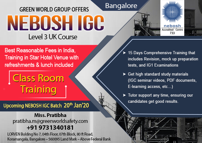 Green World Group provides an exclusive offer for the Nebosh Course in Bangalore. Nebosh Managing Safely is about the essential study of risk management in Industrial Health and Safety Management in the workplace.