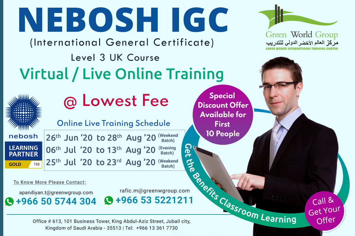 Green World Group Online NEBOSH Training provides extensive information for the learners that helps to gain practical skills to manage the workplace hazards and injuries which includes live tutor support and also provides complementary 24*7 E-learning access for the candidates which can be accessed anywhere from the world.