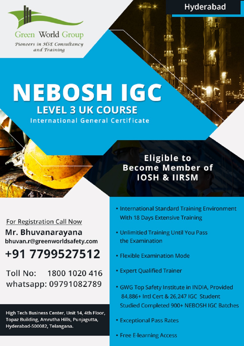 Safety Course in Hyderabad is an evergreen education in Occupational Health and Safety Management, which is offered by Green World Group. The accredited international Safety Management Courses are NEBOSH, IOSH, and ISO 45001:2018 Lead Auditor Course. These courses can be taken through both regular classroom and e-learning mode. It is an important aspect to maintain a Safe and Healthier environment in the workplace.